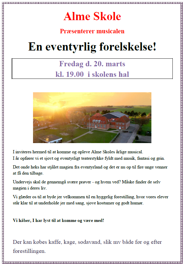 Udskolingen på Alme Skole inviterer alle til årets musical. Alle er velkomne og der er gratis entre